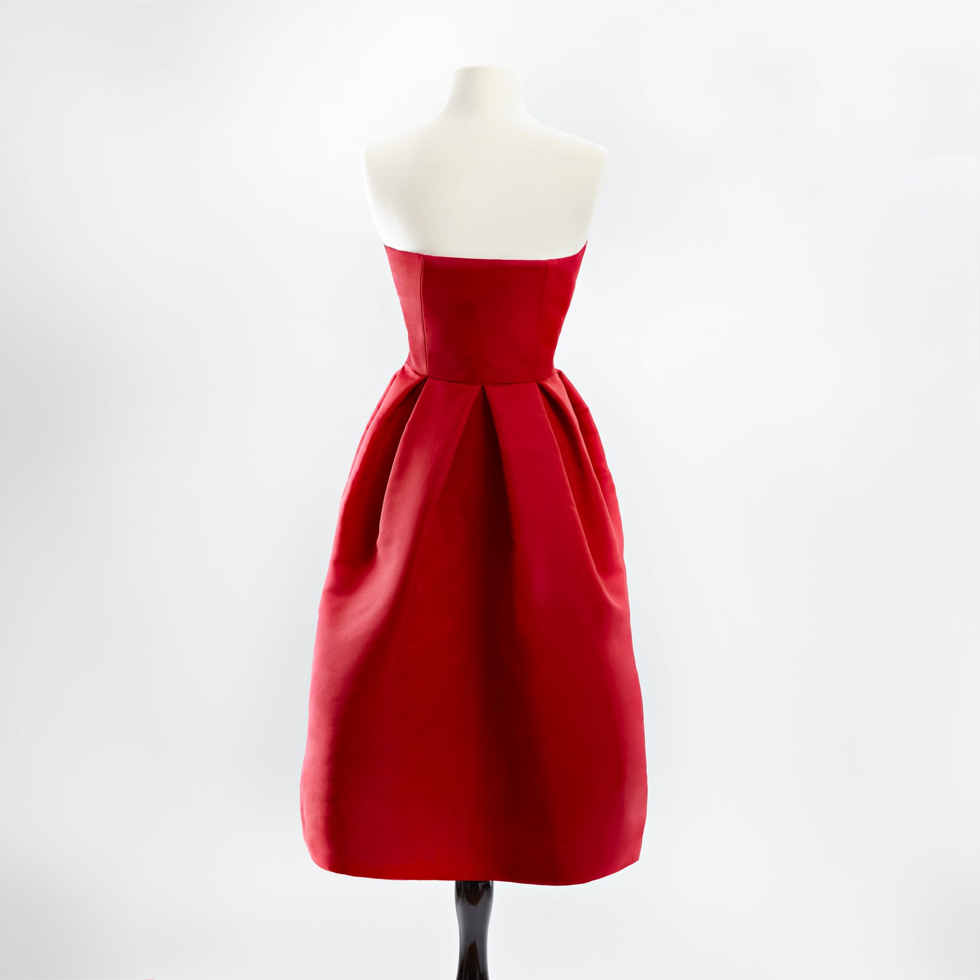 In lipstick red silk faille , this strapless, full-skirted dress is a classic to enjoy for many seasons. Featuring an interior corset with separate zipper and pockets. Available now, ready to ship!