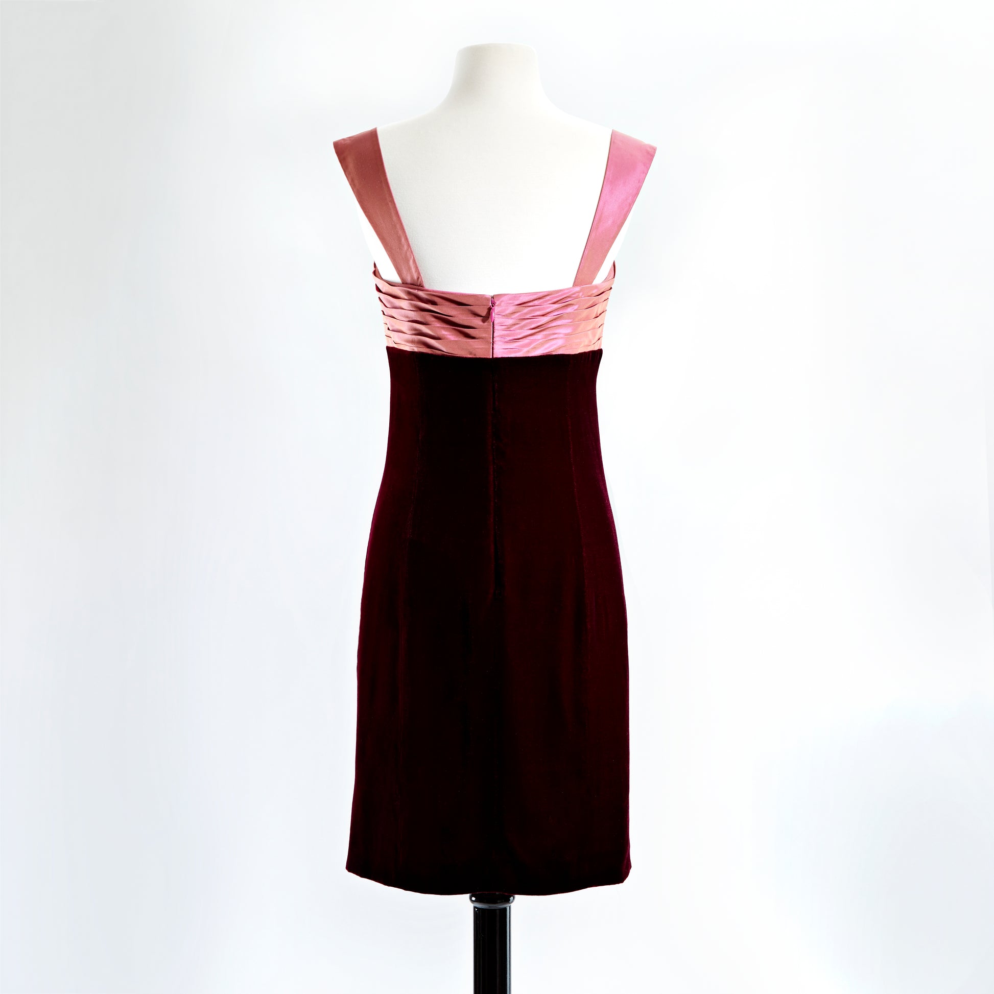 A rose silk taffeta hand draped bodice and garnet silk velvet skirt make this dress a holiday stunner! Features and interior corset with separate zipper. This sample has detached cap sleeves that we can send with the dress for future attachment. One available in a size 6. *Note model is wearing a garnet skirt and wine color bodice.
