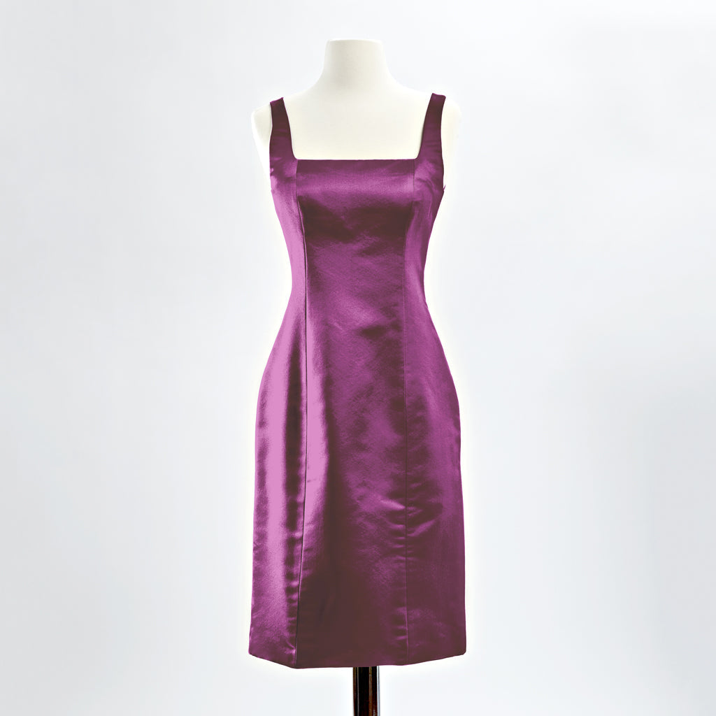 In luxurious duchess silk satin, this square neck sheath is a timeless classic. Available in a few sizes in real red, pale plum and sapphire blue jewel tones for immediate delivery. All samples have a back split for mobility.