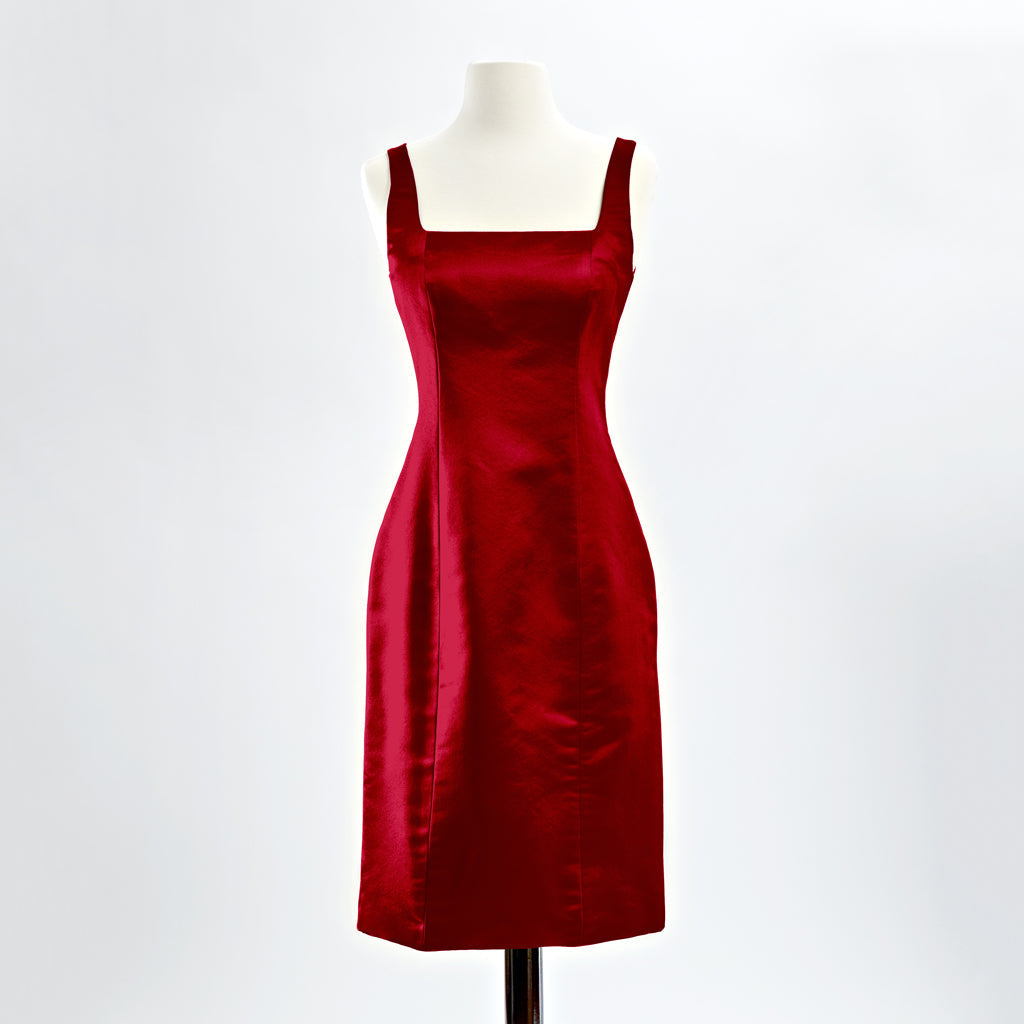 In luxurious duchess silk satin, this square neck sheath is a timeless classic. Available in a few sizes in real red, pale plum and sapphire blue jewel tones for immediate delivery. All samples have a back split for mobility.