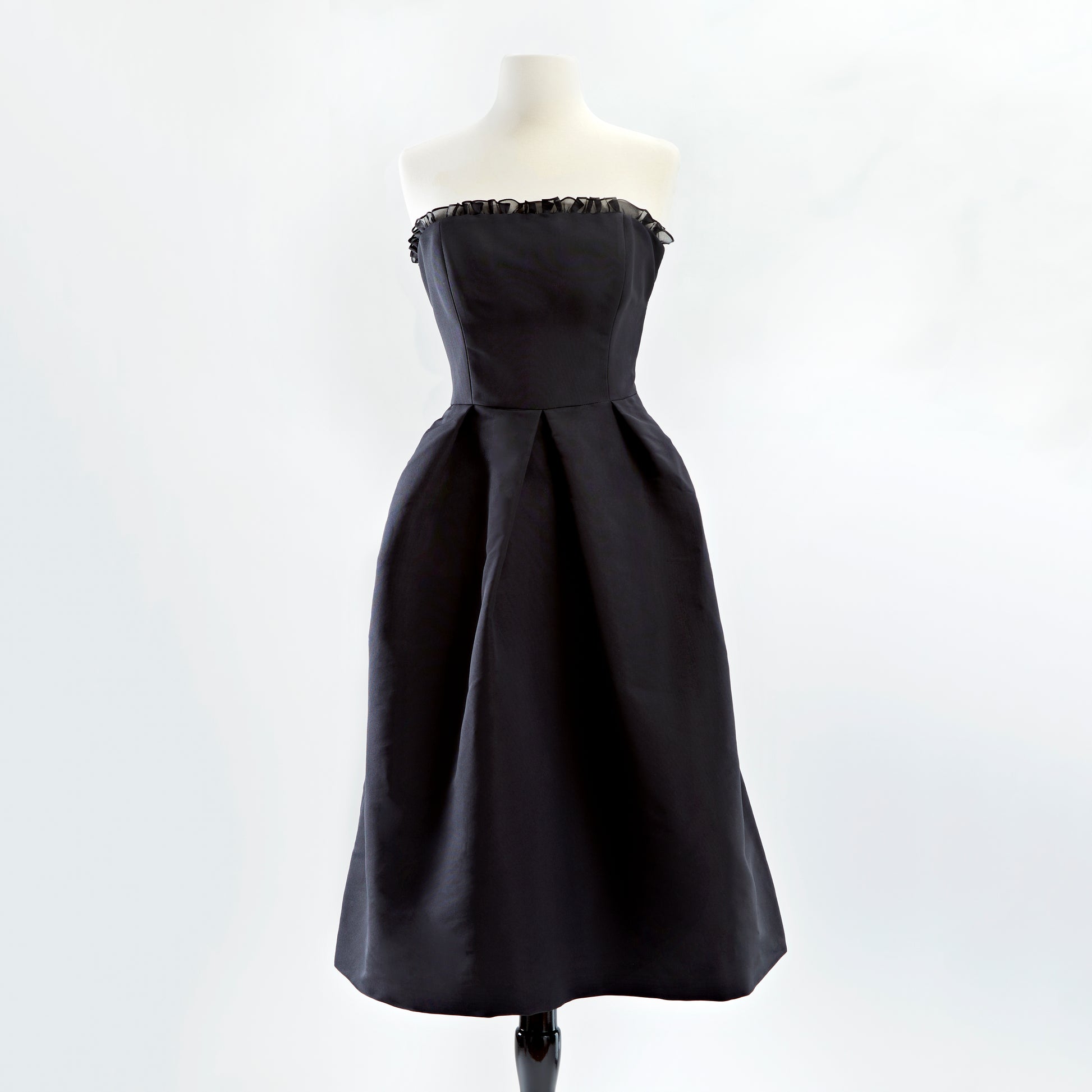 In silk faille of the blackest black, this strapless, full-skirted dress is a classic to enjoy for many seasons. Featuring an interior corset with separate zipper and pockets. This ready to ship sample includes grosgrain ribbon straps that you can tuck in or tie at the shoulder for two different looks. *Note black Lily dress on model includes organza bodice ruffle and no ribbon straps. Those sold ready to ship do not include a ruffle option but do include the ribbon straps as shown on the red version image.
